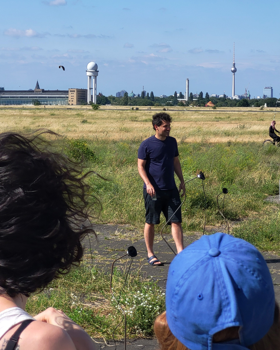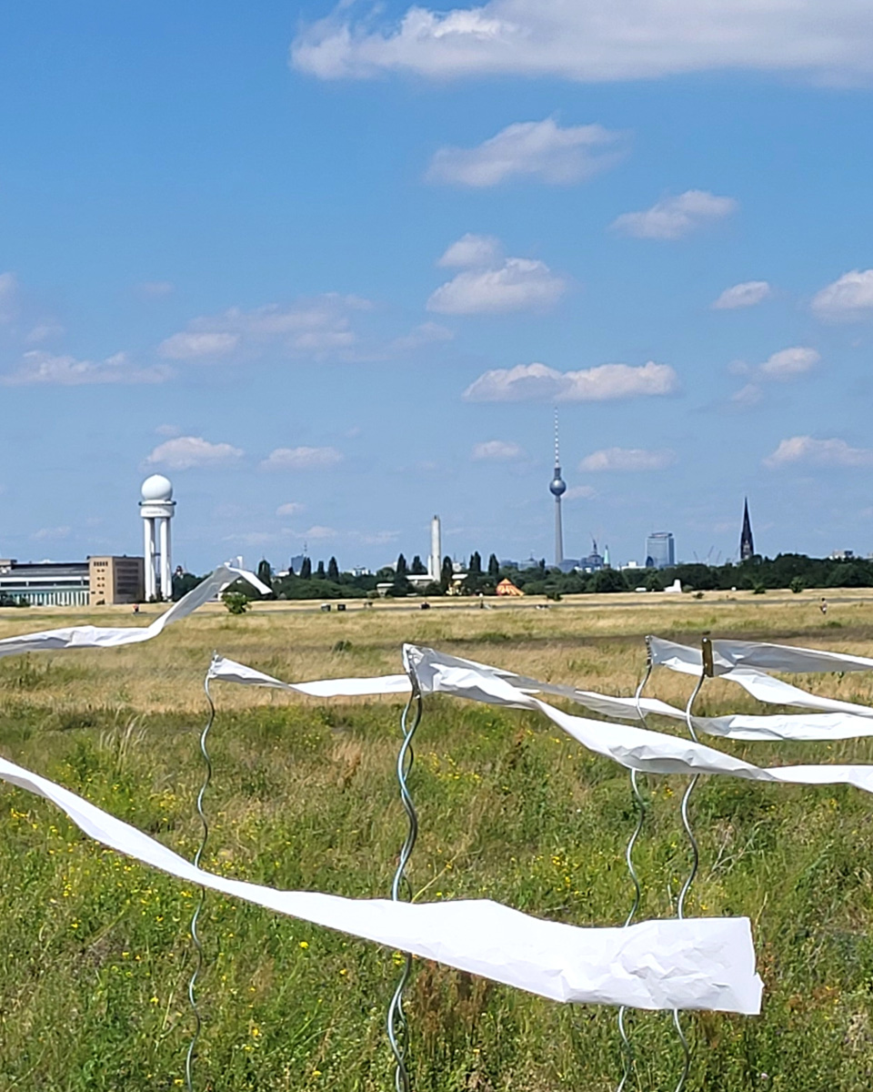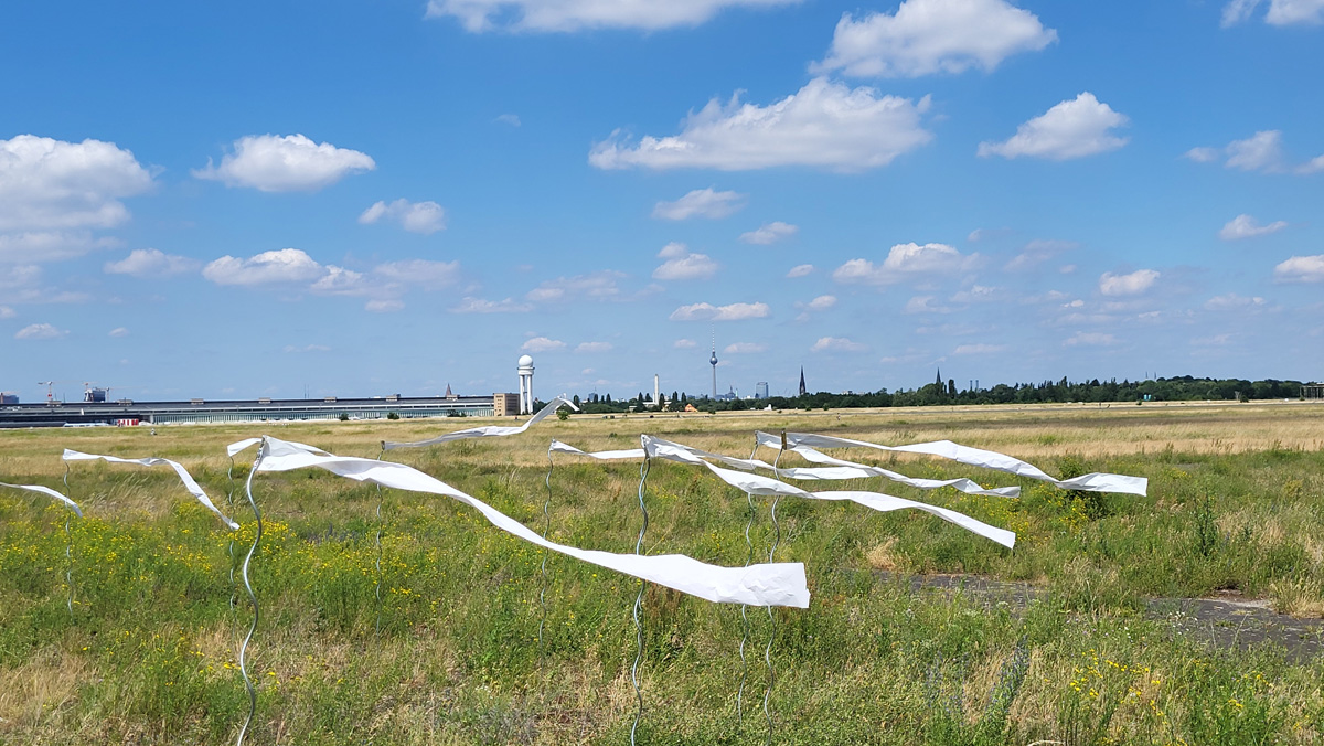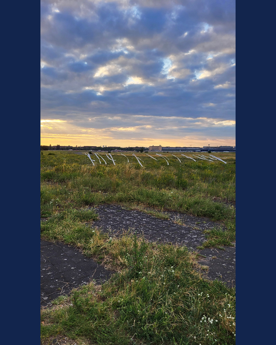 Auch die Geschichte des Geländes ist vielschichtig. Als ehemaliger Flughafen war Tempelhof ein Ort militärischer Präsenz, Zwangsarbeit aber auch westlicher Symbolpolitik. Während der deutschen Teilung war er eine der wenigen Zugangsmöglichkeiten nach West-Berlin. Sichtbare und unsichtbare Grenzen wie Bezirkslinien, Zäune und Wege durchziehen das Feld bis heute. Es bleibt ein Raum der Übergänge und der kontinuierlichen Überschreibungen.