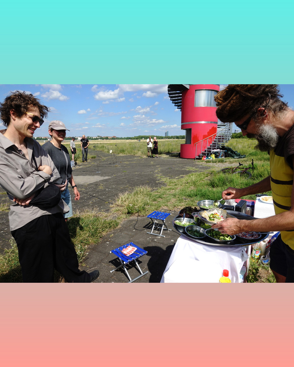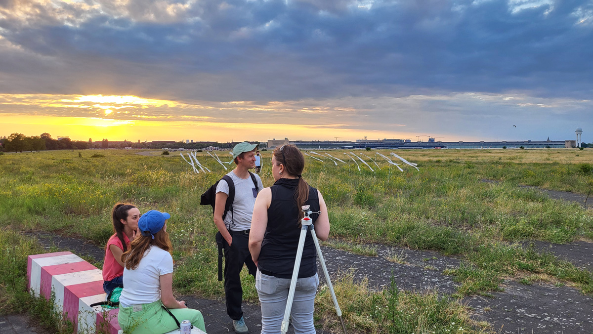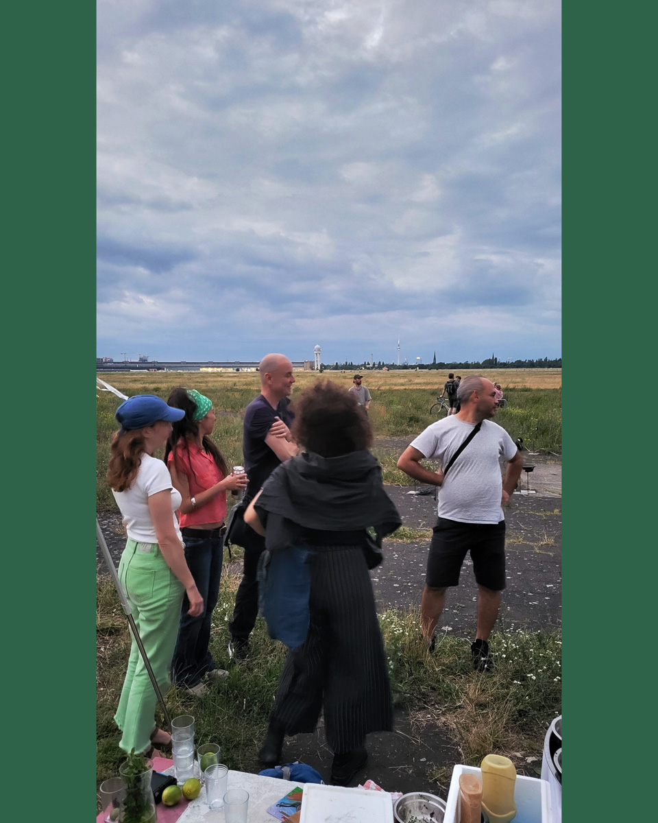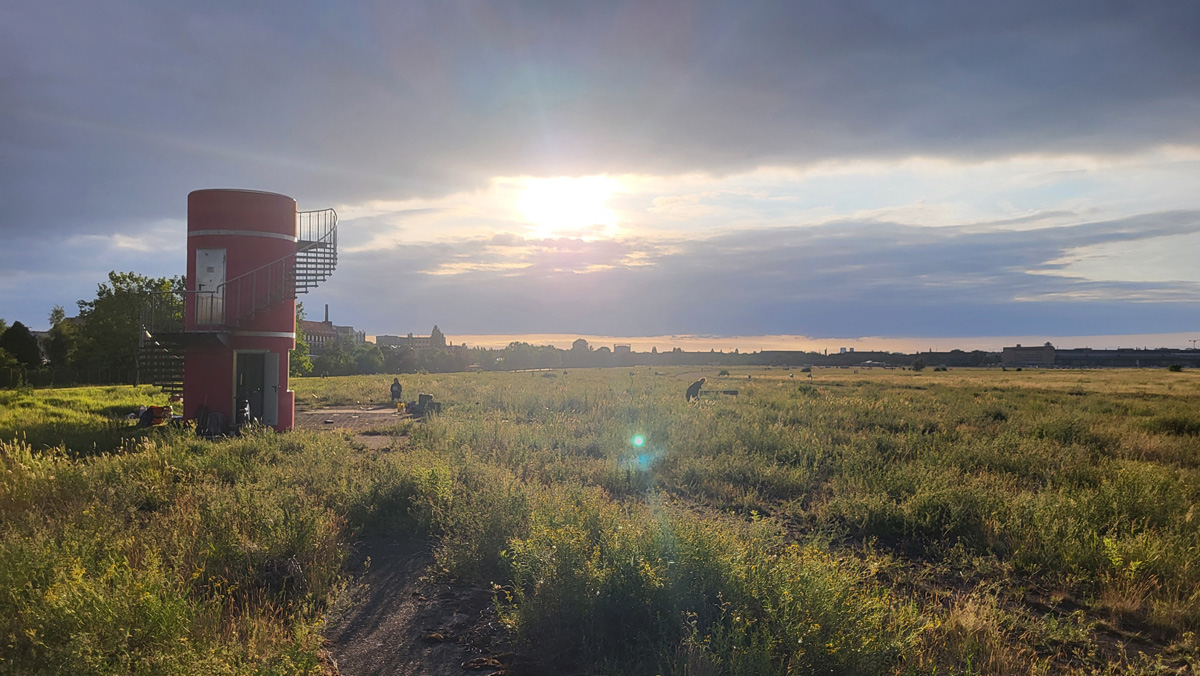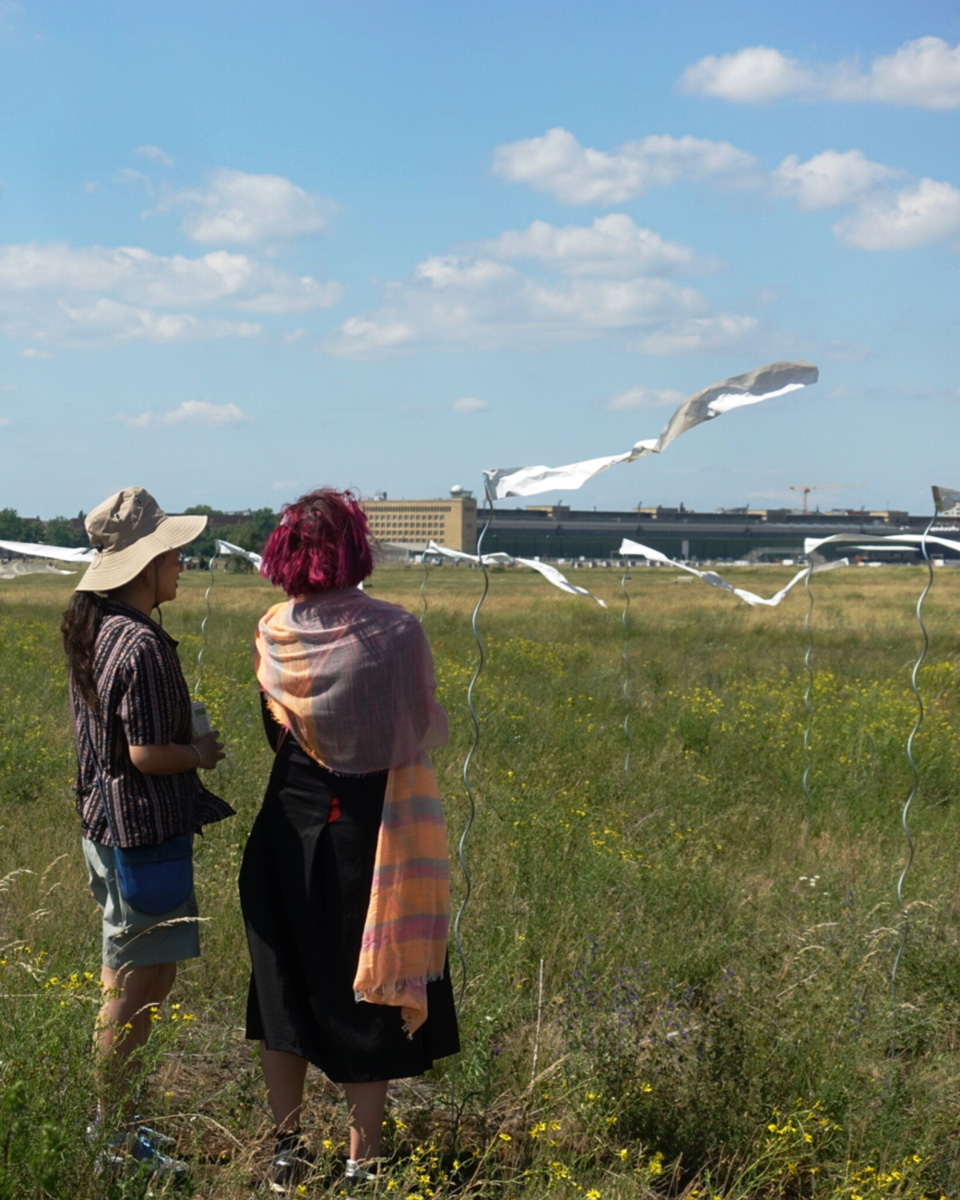 Auch die Geschichte des Geländes ist vielschichtig. Als ehemaliger Flughafen war Tempelhof ein Ort militärischer Präsenz, Zwangsarbeit aber auch westlicher Symbolpolitik. Während der deutschen Teilung war er eine der wenigen Zugangsmöglichkeiten nach West-Berlin. Sichtbare und unsichtbare Grenzen wie Bezirkslinien, Zäune und Wege durchziehen das Feld bis heute. Es bleibt ein Raum der Übergänge und der kontinuierlichen Überschreibungen.